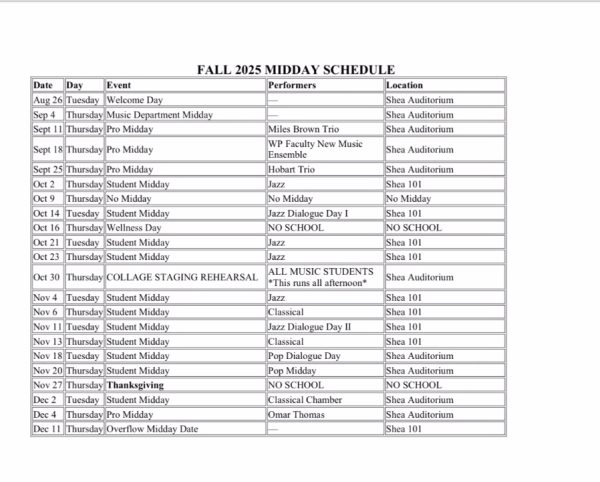 For information on future Midday events, you can view the schedule made by Payton MacDonald, the chairman of the Music Department, according to Navarro.